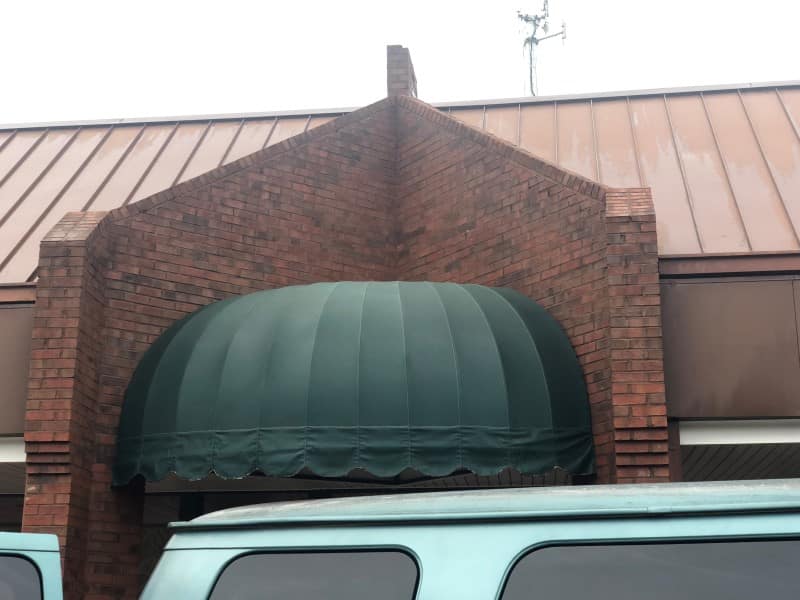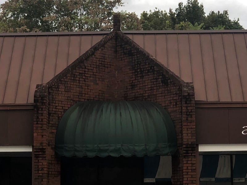 This customer had black algae growing on the inset areas above their awnings in their plaza. We treated the algae multiple times to loosen it up and get it ready for removal, then we pressure cleaned it with hot water. We also Pressure cleaned the algae and lichen off of the awnings and rinsed the aggregate concrete to remove any dirt and leaves.